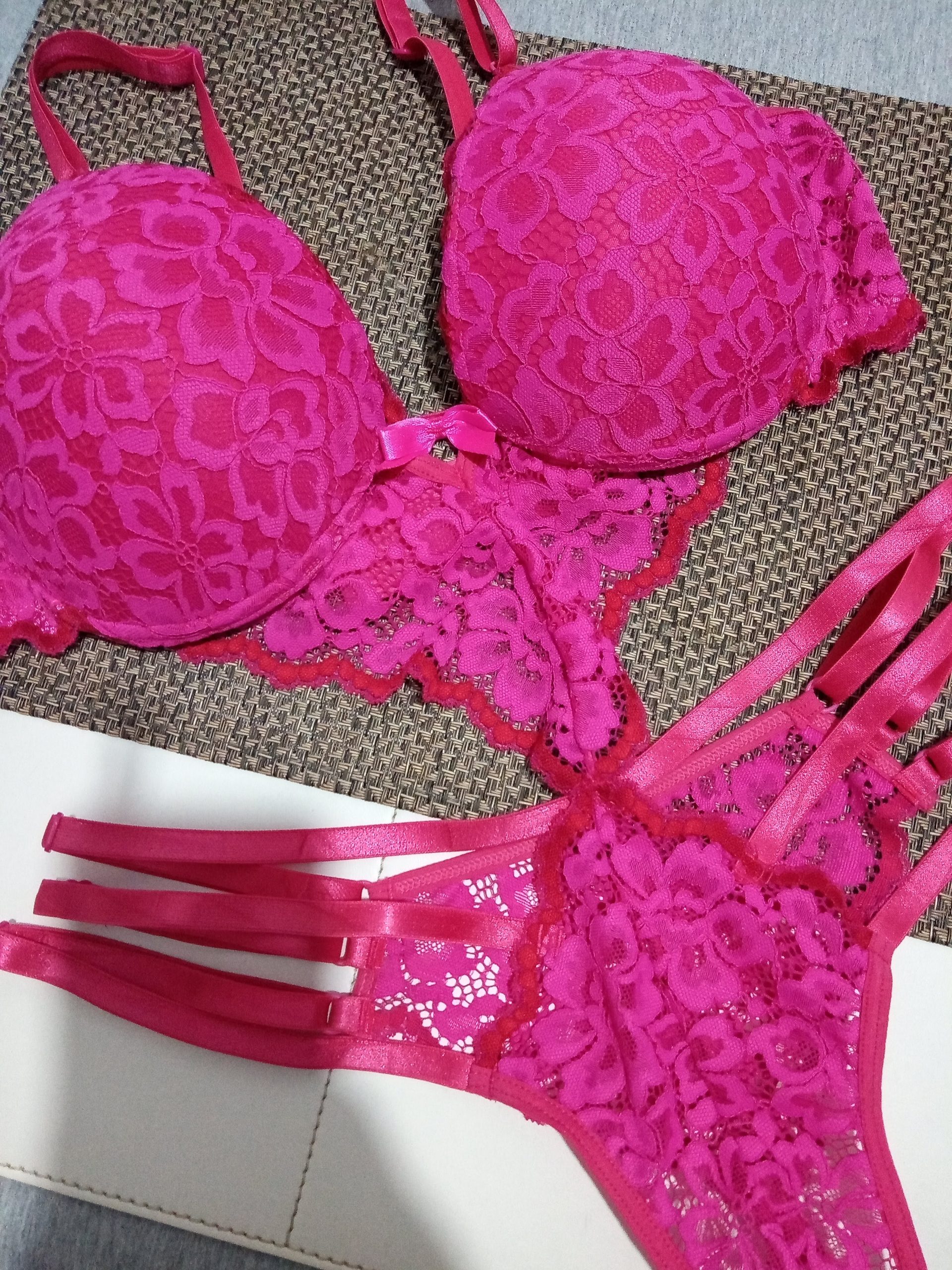 O sutiã com bojo acolchoado destaca e modela o busto de maneira elegante. A calcinha fio dental, adornada com três tiras reguláveis, adiciona um toque ousado e sensual ao conjunto.