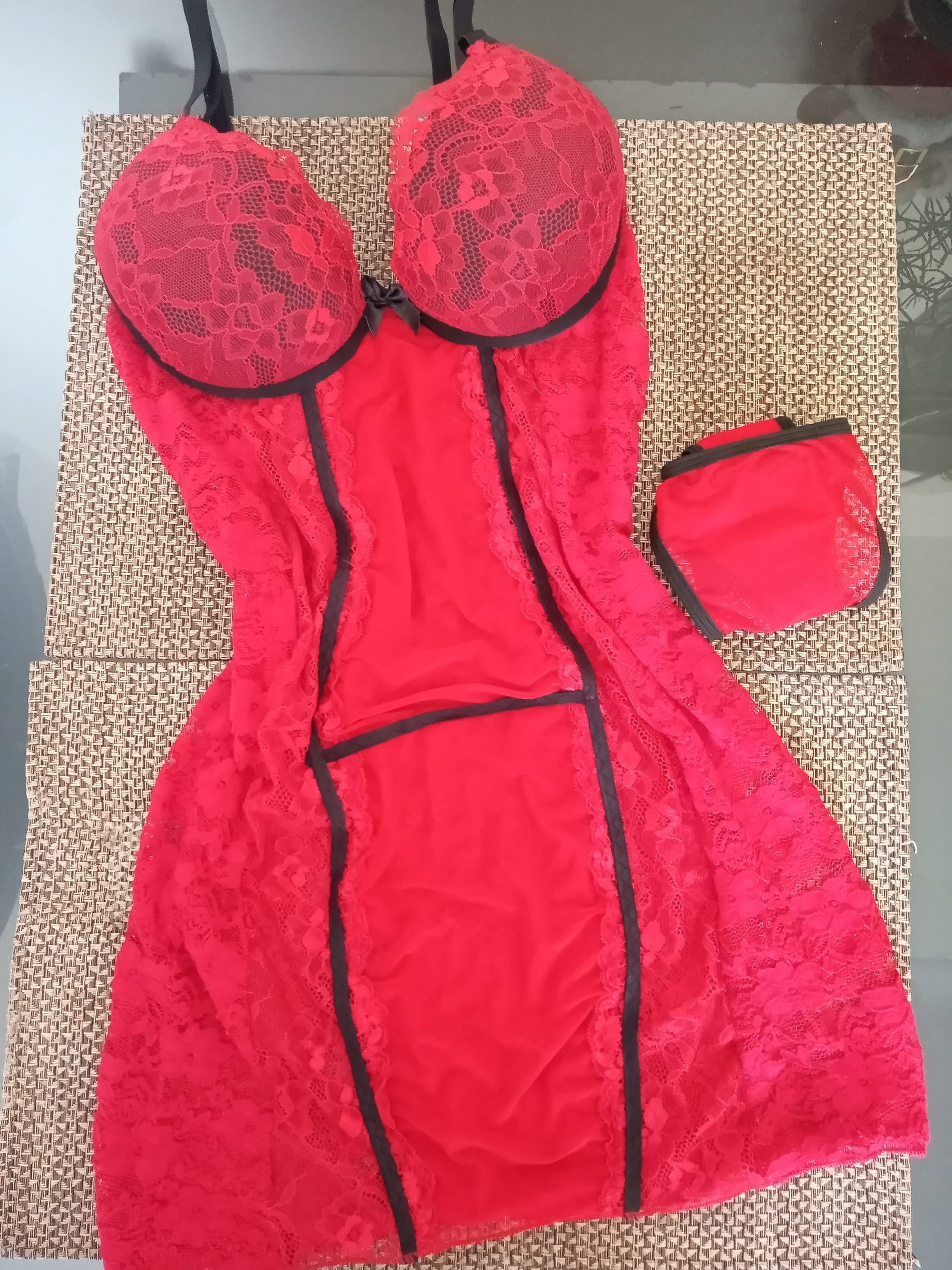 A camisola com bojo acolchoado, confeccionada em renda com detalhes em microtule, proporciona uma sensação suave e leve, enquanto os detalhes em microtule adicionam um toque sedutor. O conjunto inclui uma calcinha fio dental, complementando a sensualidade da peça.
