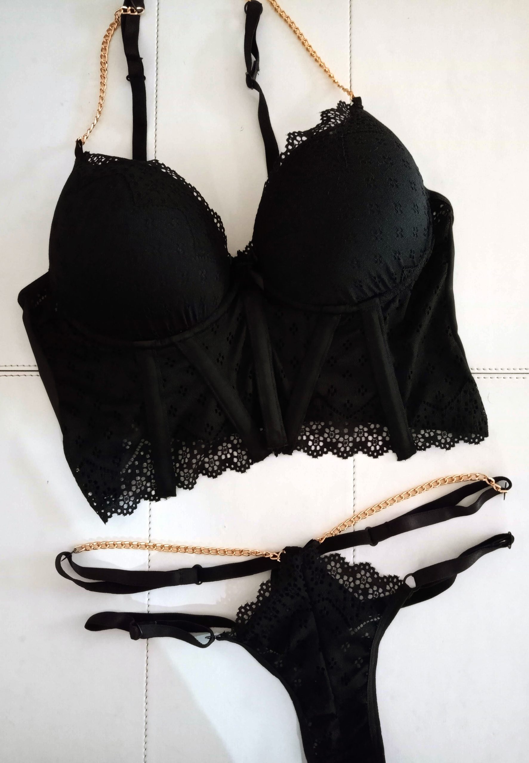 O croped com bojo acolchoado em renda, alças com detalhes em correntes, proporciona um visual sedutor e destaca o busto de maneira encantadora. A calcinha fio dental com 2 tiras e detalhes em correntes complementa o conjunto, adicionando um toque provocante à peça.
